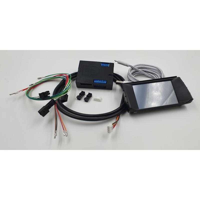 The screen replaces the centre air vent slat and connects via the supplied harness. Some rewiring is required using the included socket housings. Professional fitting is recommended for the best result and to retain the factory finish.