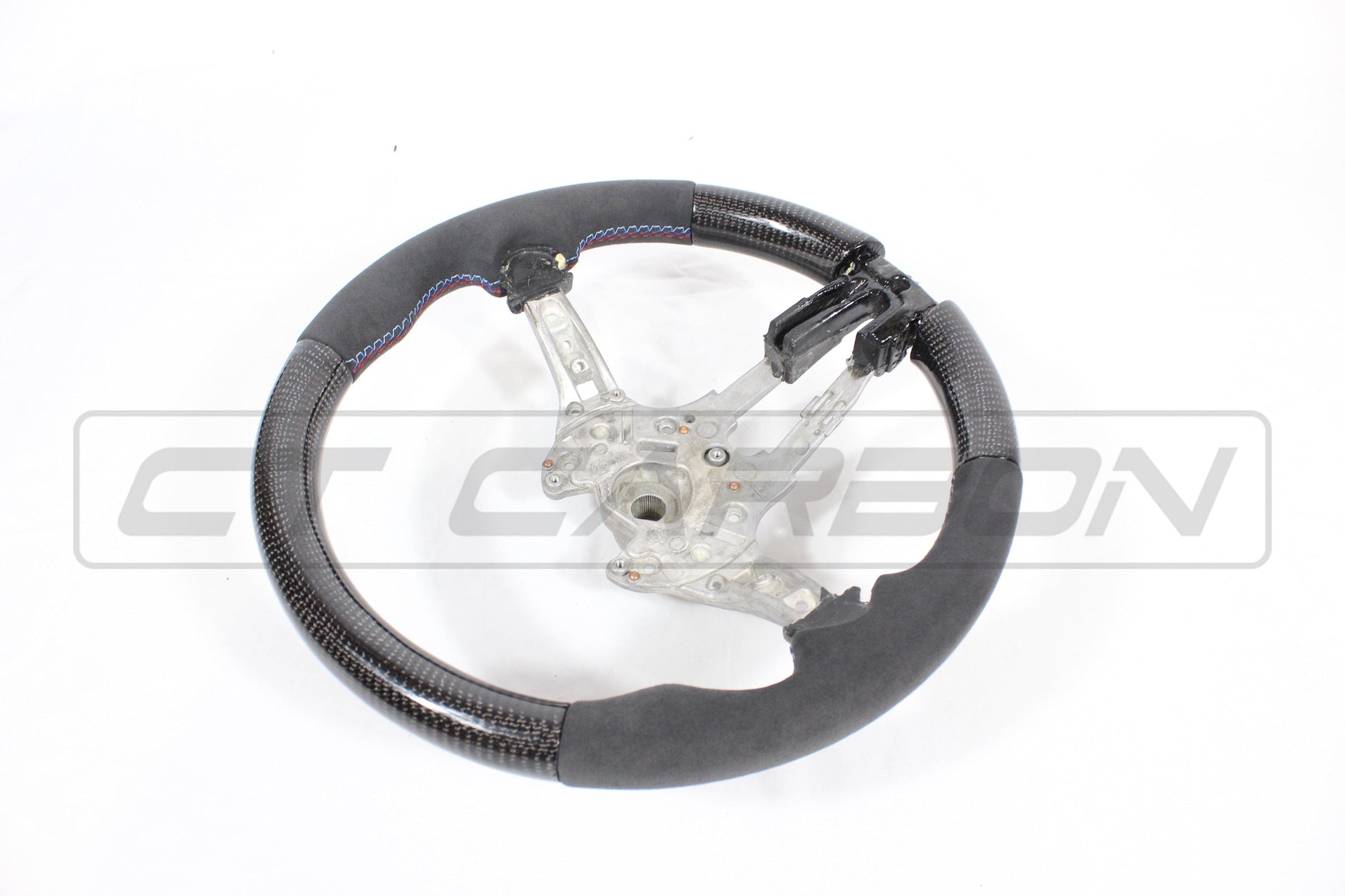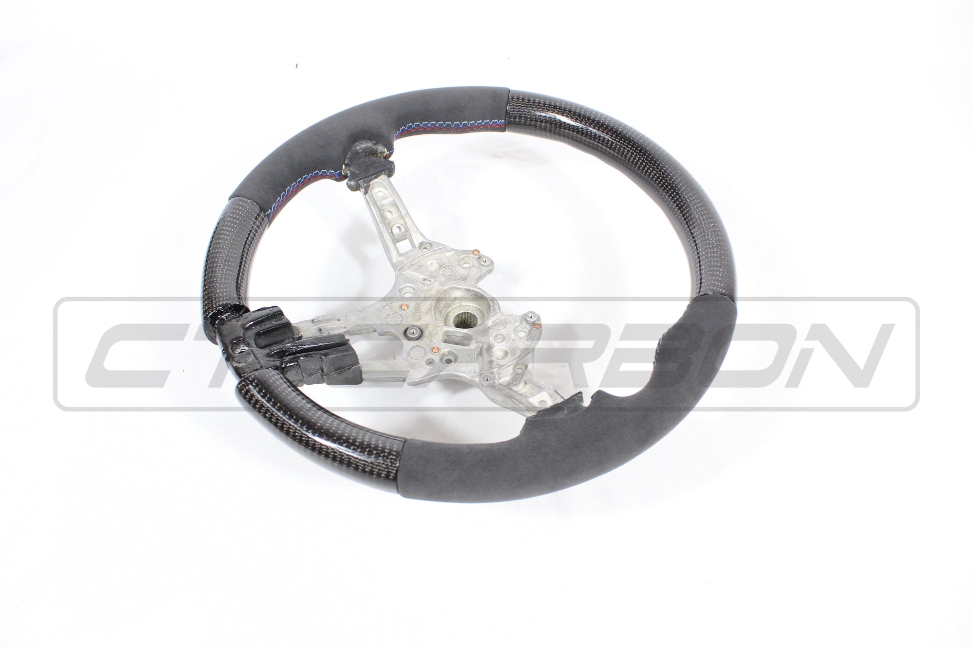 CT Carbon steering wheel constructed from quality carbon fibre and Alcantara with stitching. Made using an original BMW steering wheel and transformed by CT Carbon for a premium finish.