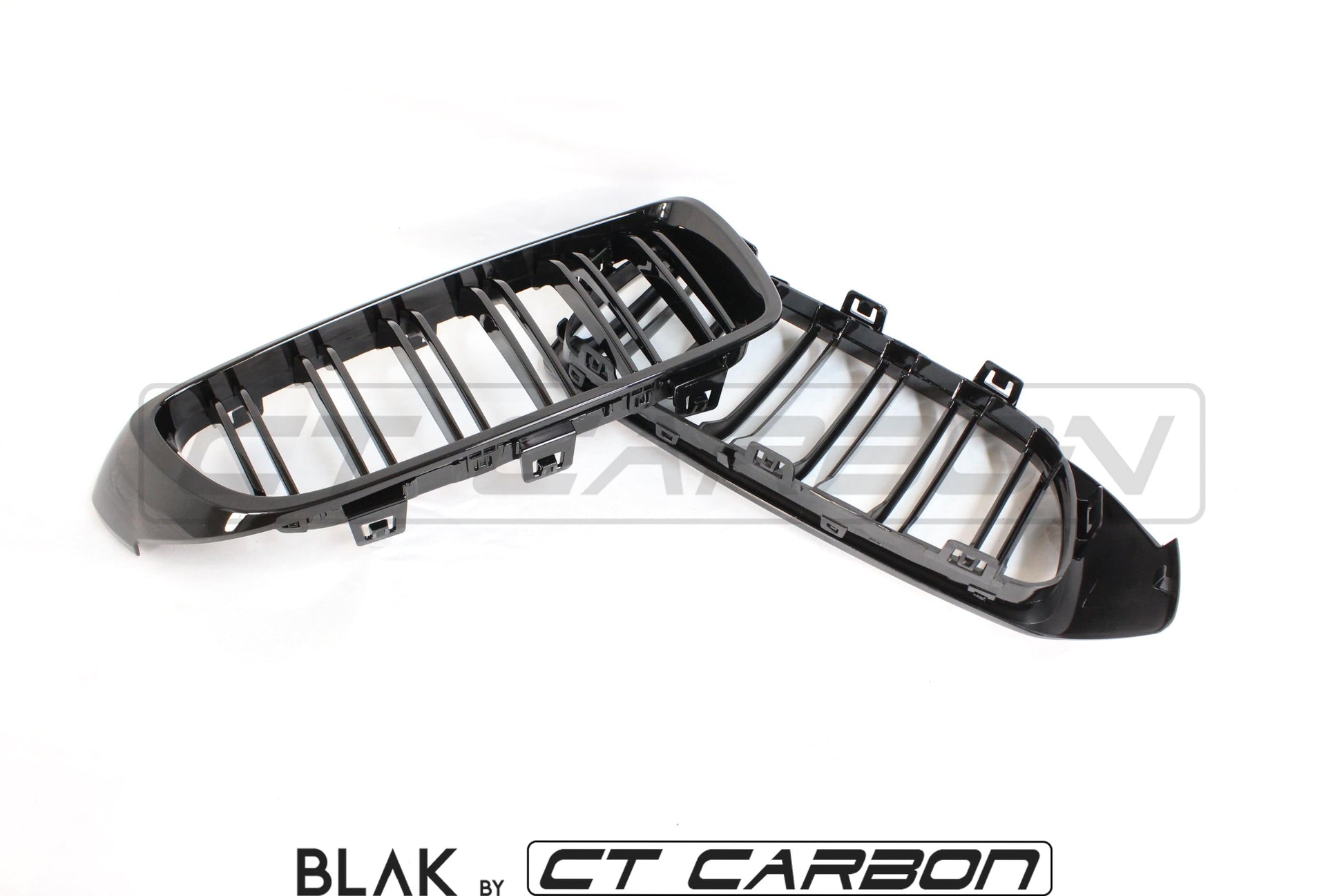 BMW M4 F82 F83 & 4 Series F32 F33 F36 (F3x) Kidney Grilles Twin/Double Slat Black Shadowline Blackout De-Chrome M Performance Style Front Grill Replacement Set 2013-2020 | BLAK by CT Carbon ABS