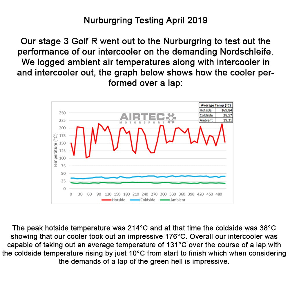 Repeated dyno sessions against the OE cooler show a clear reduction in charge temperatures with the AIRTEC unit, keeping IATs closer to ambient and maintaining power where the stock cooler quickly heat soaks. Ideal for Stage 1, Stage 2 and higher-output MQB builds targeting 400 bhp and beyond, with consistent results on both manual and DSG cars.