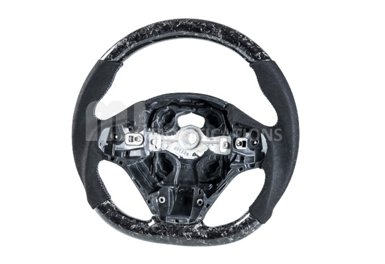 Flat Bottom Sport Steering Wheel design, real Forged Carbon Fiber+ Perforated Leather with M colors stitching.